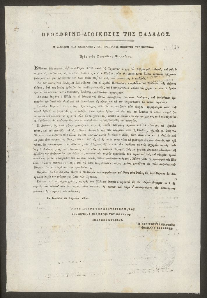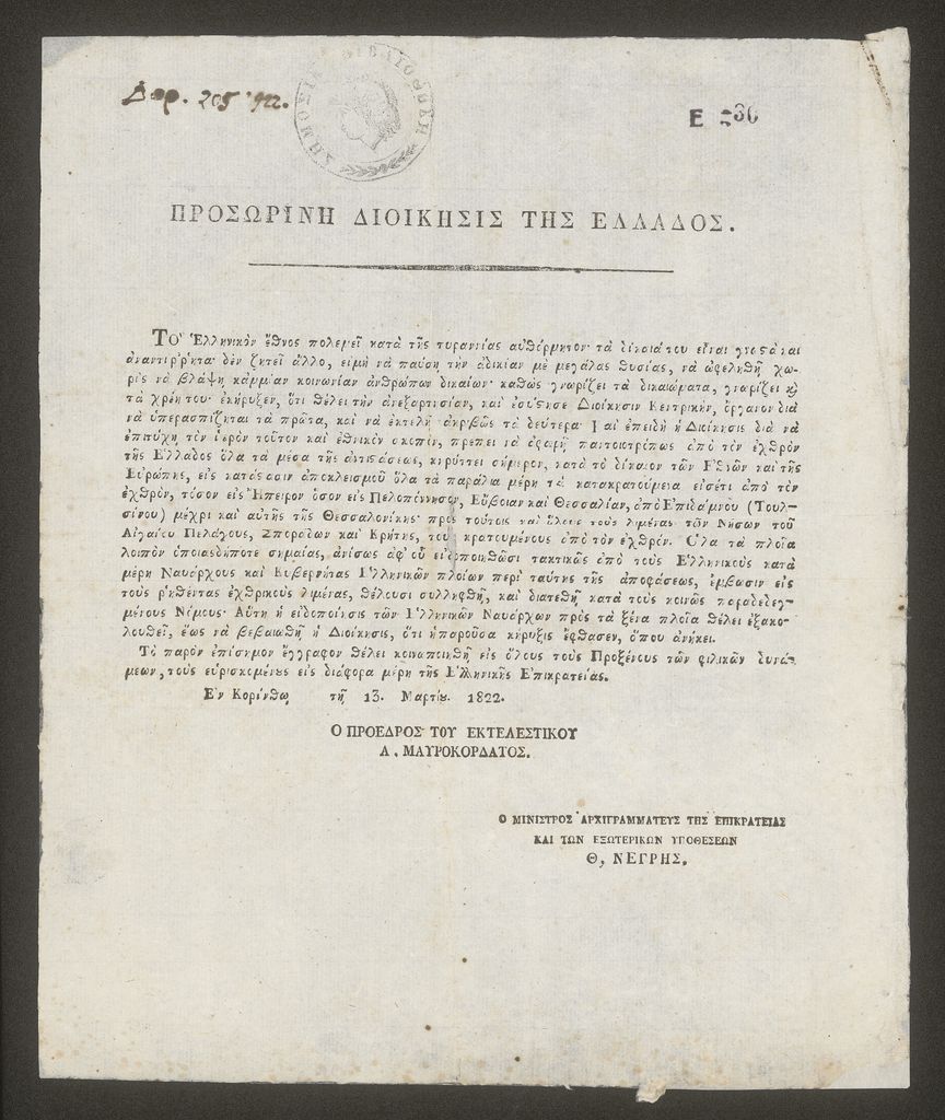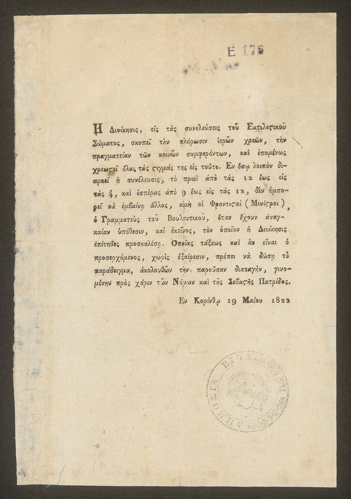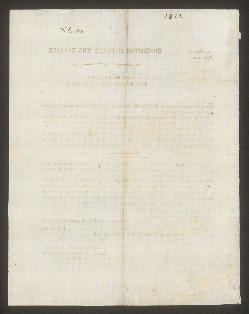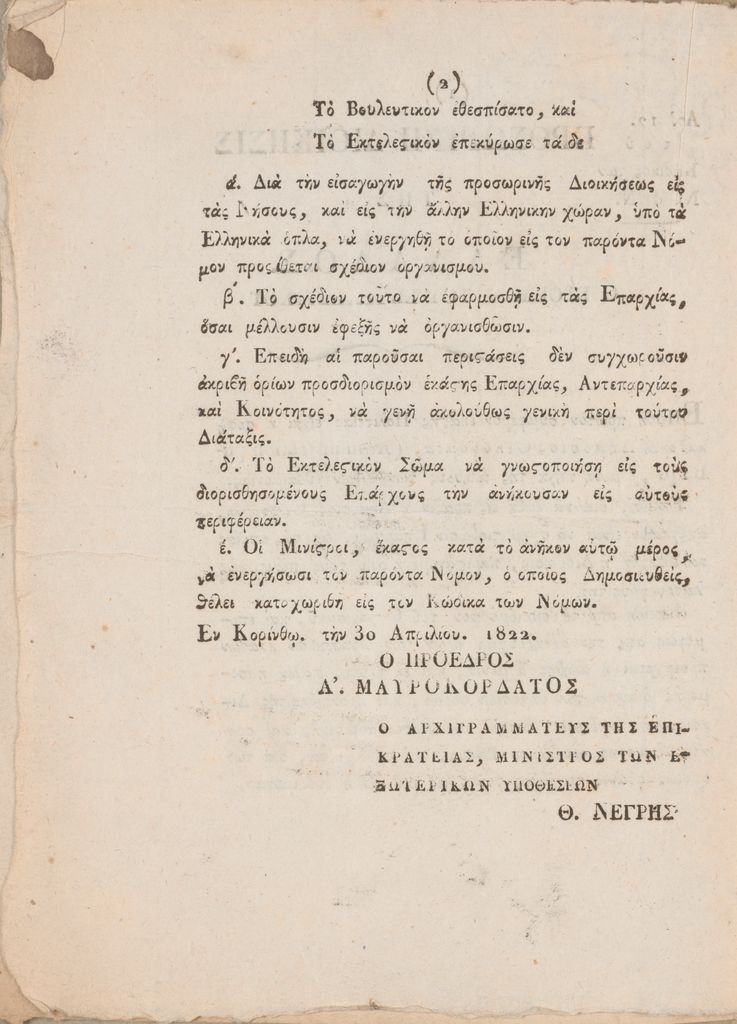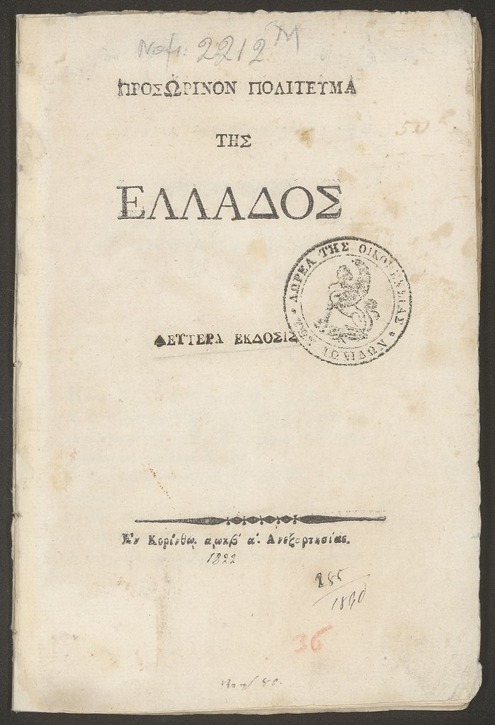 Στις αρχές του 1822, κατά τη διάρκεια των εργασιών της Α΄ Εθνοσυνέλευσης στην Επίδαυρο, ψηφίστηκε το Προσωρινόν Πολίτευμα της Ελλάδος, ο πρώτος συνταγματικός χάρτης της χώρας, και εκλέχθηκε η πρώτη κυβέρνηση με προσωρινή έδρα την Κόρινθο. Εκεί εγκαταστάθηκε το τυπογραφείο, το οποίο συνέχισε τις εργασίες του από τον Μάρτιο έως τον Ιούλιο, όταν η ανακατάληψη της Κορίνθου από τους Τούρκους διέκοψε απότομα τη λειτουργία του. Από τα έντυπα που τυπώθηκαν στην Κόρινθο ξεχωρίζουν δύο διαδοχικές εκδόσεις του Προσωρινού Πολιτεύματος της Ελλάδος, καθώς επίσης και διοικητικά μονόφυλλα.
