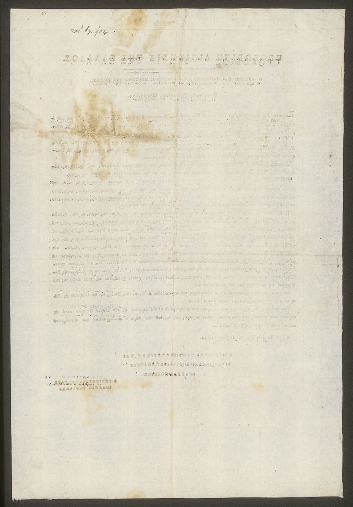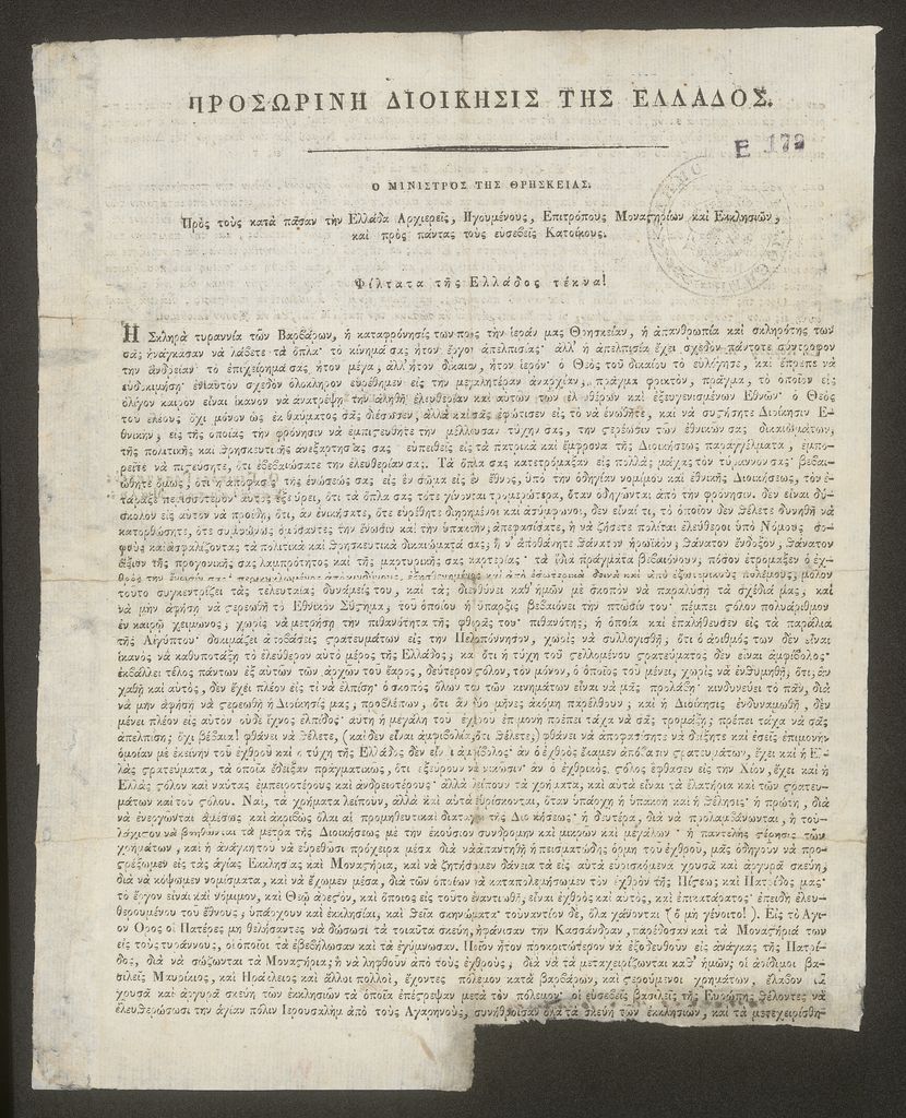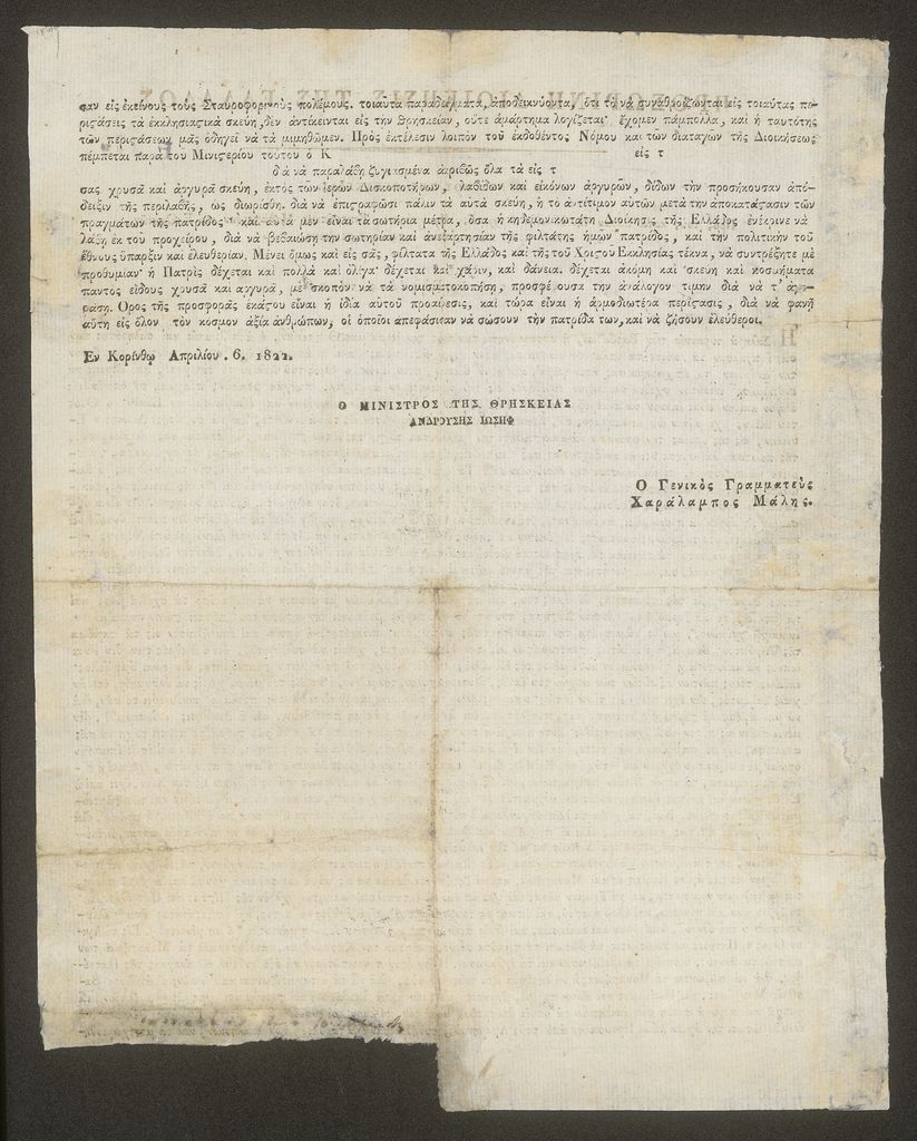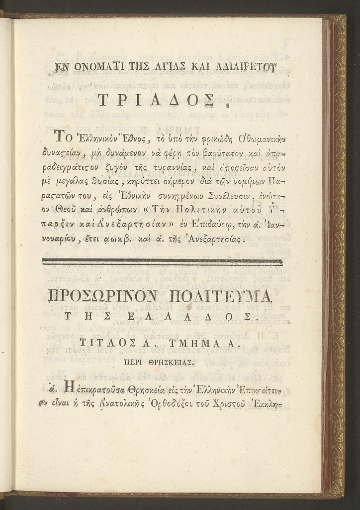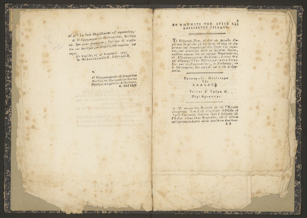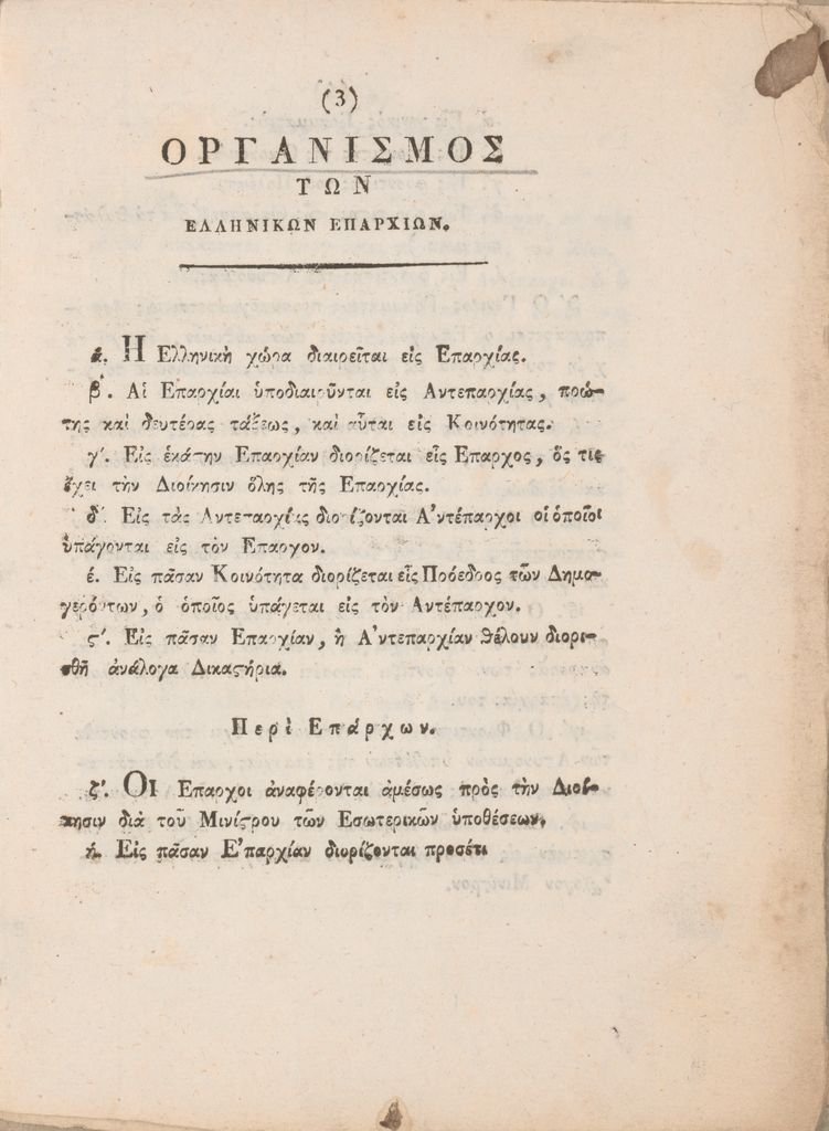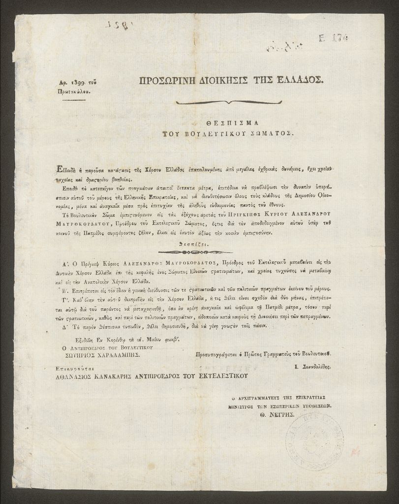 Στις αρχές του 1822, κατά τη διάρκεια των εργασιών της Α΄ Εθνοσυνέλευσης στην Επίδαυρο, ψηφίστηκε το Προσωρινόν Πολίτευμα της Ελλάδος, ο πρώτος συνταγματικός χάρτης της χώρας, και εκλέχθηκε η πρώτη κυβέρνηση με προσωρινή έδρα την Κόρινθο. Εκεί εγκαταστάθηκε το τυπογραφείο, το οποίο συνέχισε τις εργασίες του από τον Μάρτιο έως τον Ιούλιο, όταν η ανακατάληψη της Κορίνθου από τους Τούρκους διέκοψε απότομα τη λειτουργία του. Από τα έντυπα που τυπώθηκαν στην Κόρινθο ξεχωρίζουν δύο διαδοχικές εκδόσεις του Προσωρινού Πολιτεύματος της Ελλάδος, καθώς επίσης και διοικητικά μονόφυλλα.