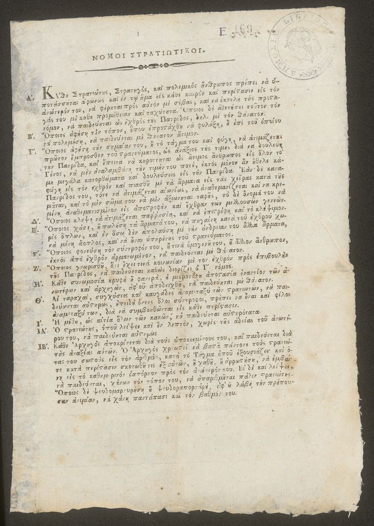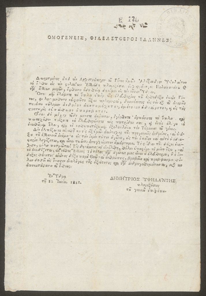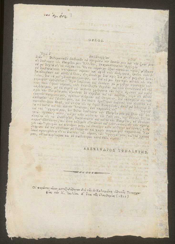 Τον Ιούνιο του 1821 ο Δημήτριος Υψηλάντης έφθασε στην Ύδρα και τότε περίπου έφθασε στην Ελλάδα και ο εξοπλισμός του πρώτου επαναστατικού τυπογραφείου. Η λειτουργία του πρώτου τυπογραφείου, το οποίο στεγάστηκε σε ένα τζαμί στην Καλαμάτα, ξεκίνησε τον Ιούλιο του ίδιου χρόνου. Η ευθύνη της λειτουργίας του ανατέθηκε στον έμπειρο τυπογράφο των Κυδωνιών (Αϊβαλί) Κωνσταντίνο Τόμπρα, σε συνεργασία με τον Αναστάσιο Νικολαΐδη. Μία από τις πρώτες φροντίδες του τυπογραφείου ήταν η κυκλοφορία εφημερίδας με εκδότη τον Θεόκλητο Φαρμακίδη και με τίτλο Σάλπιγξ Ἑλληνικὴ. Ωστόσο, η λειτουργία του τυπογραφείου στην Καλαμάτα ήταν βραχύβια. Μετά την άλωση της Τριπολιτσάς, στις 23 Σεπτεμβρίου, το τυπογραφείο μεταφέρθηκε εκεί από τον Κ. Τόμπρα και στη συνέχεια στο Άργος.