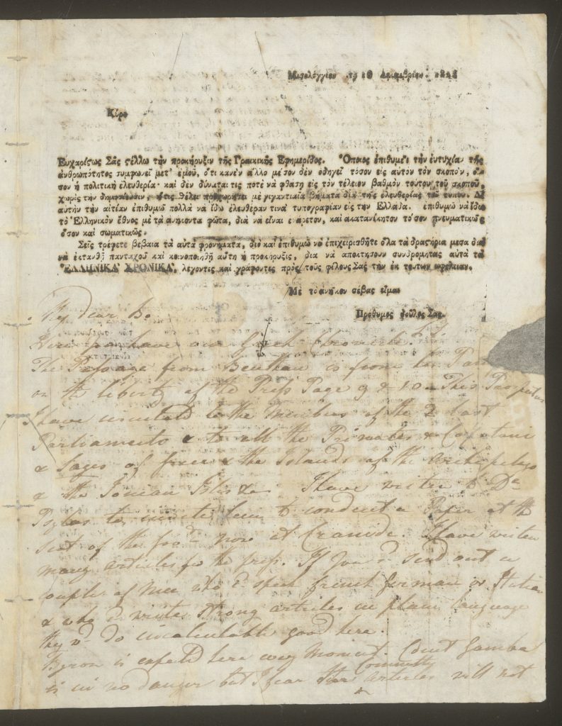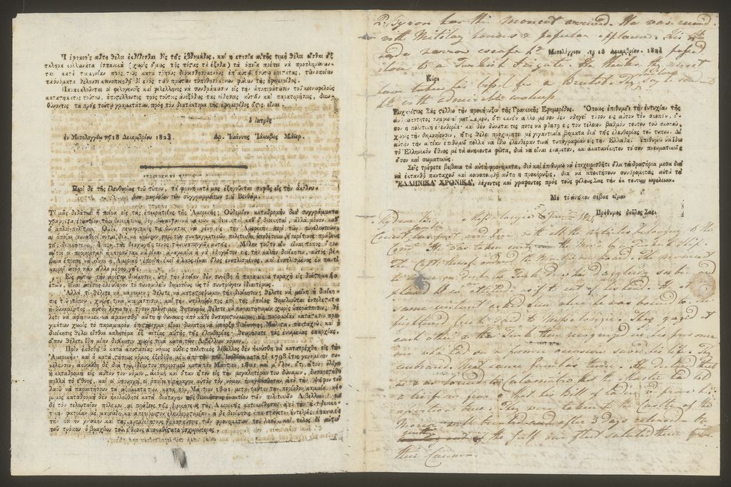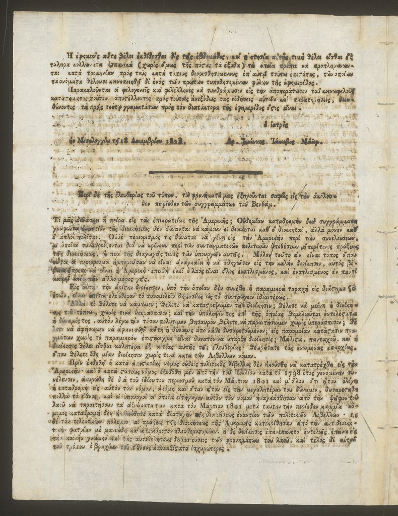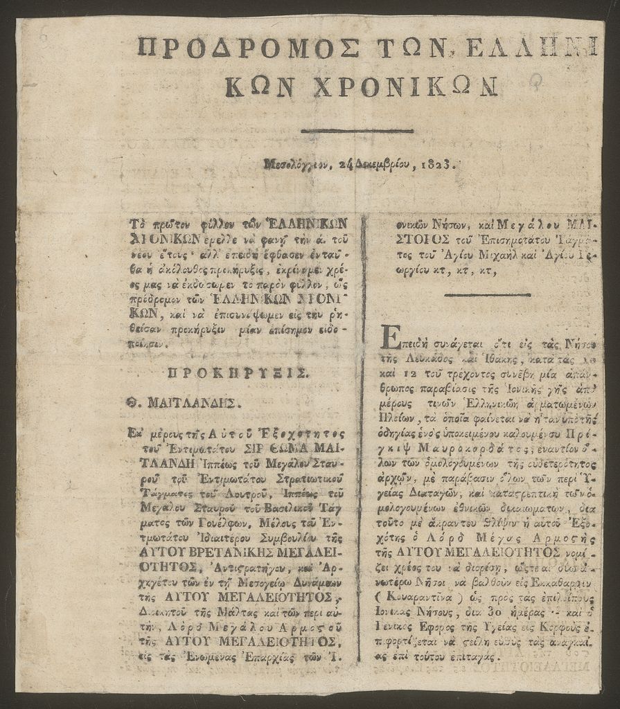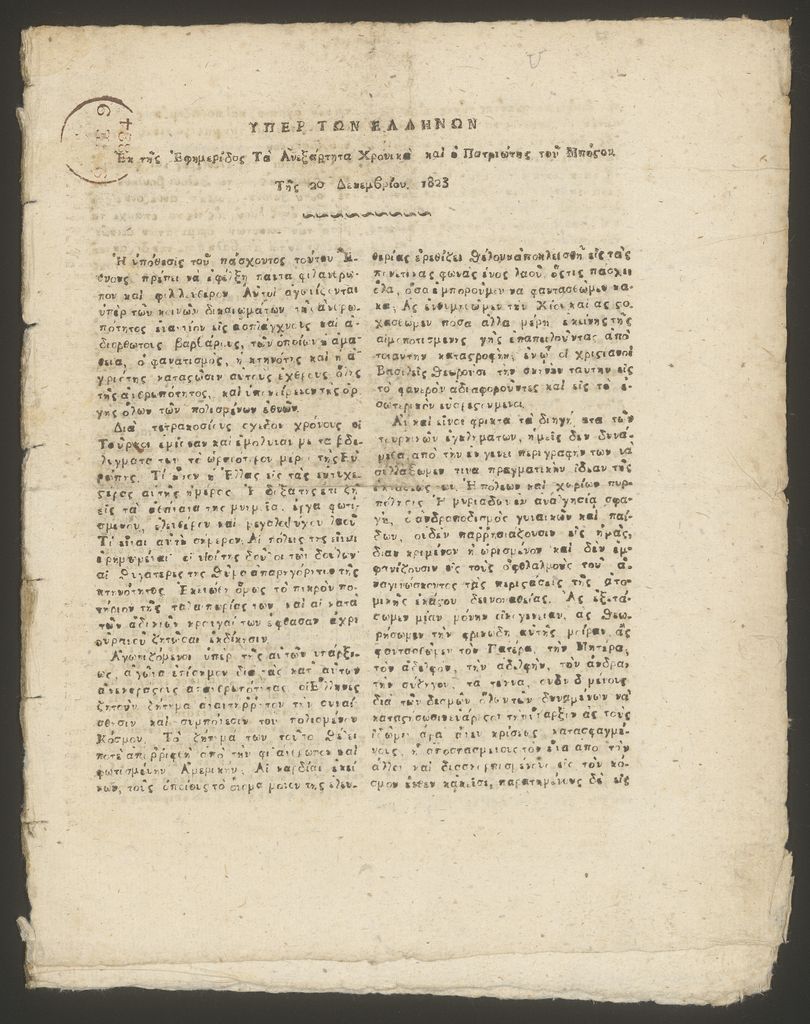 Αγγελία για την έκδοση της εφημερίδας Ἑλληνικὰ Χρονικά. Είναι το πρώτο έντυπο που εκδόθηκε στο Μεσολόγγι και περιέχει, εκτός από την αγγελία, εκτενές απόσπασμα κειμένου του Άγγλου νομικού και φιλοσόφου Jeremy Bentham για την ελευθερία του Τύπου εν είδει διακήρυξης αρχών της εφημερίδας, και μια σύντομη επιστολή με την οποία παρακαλείται ο αποδέκτης να διαδώσει την αγγελία με όσα μέσα διαθέτει, ώστε να συγκεντρωθούν αρκετοί συνδρομητές.