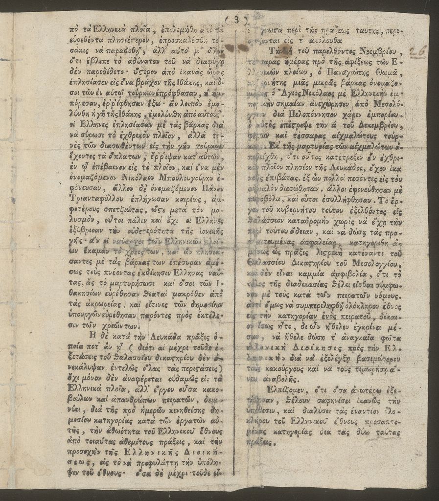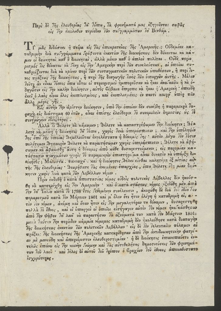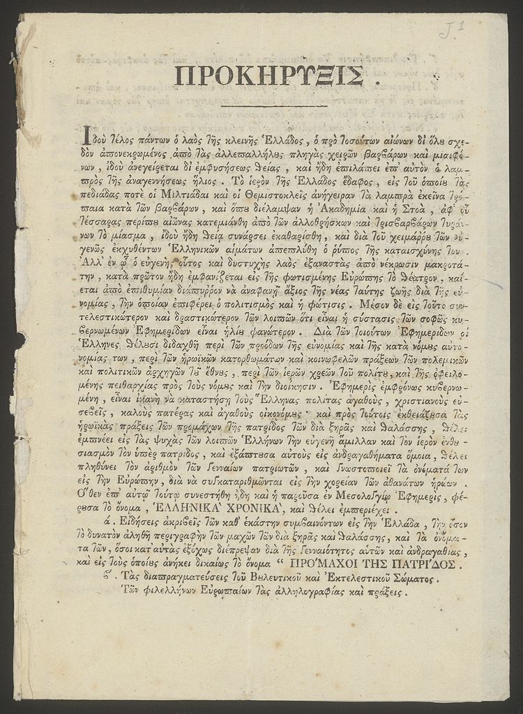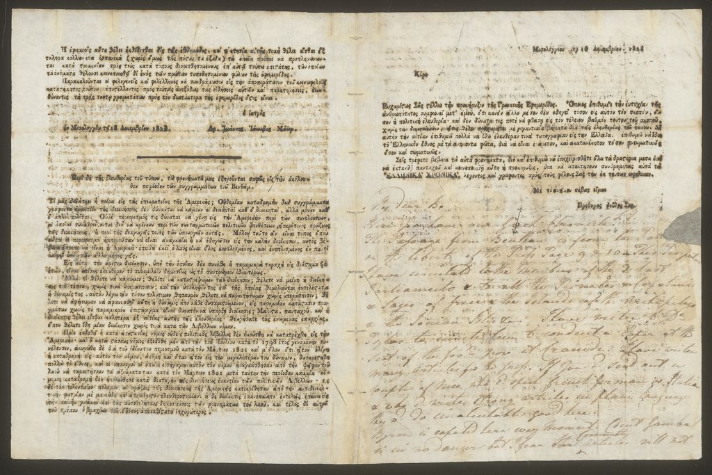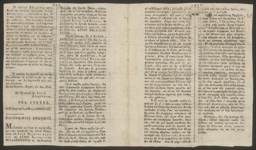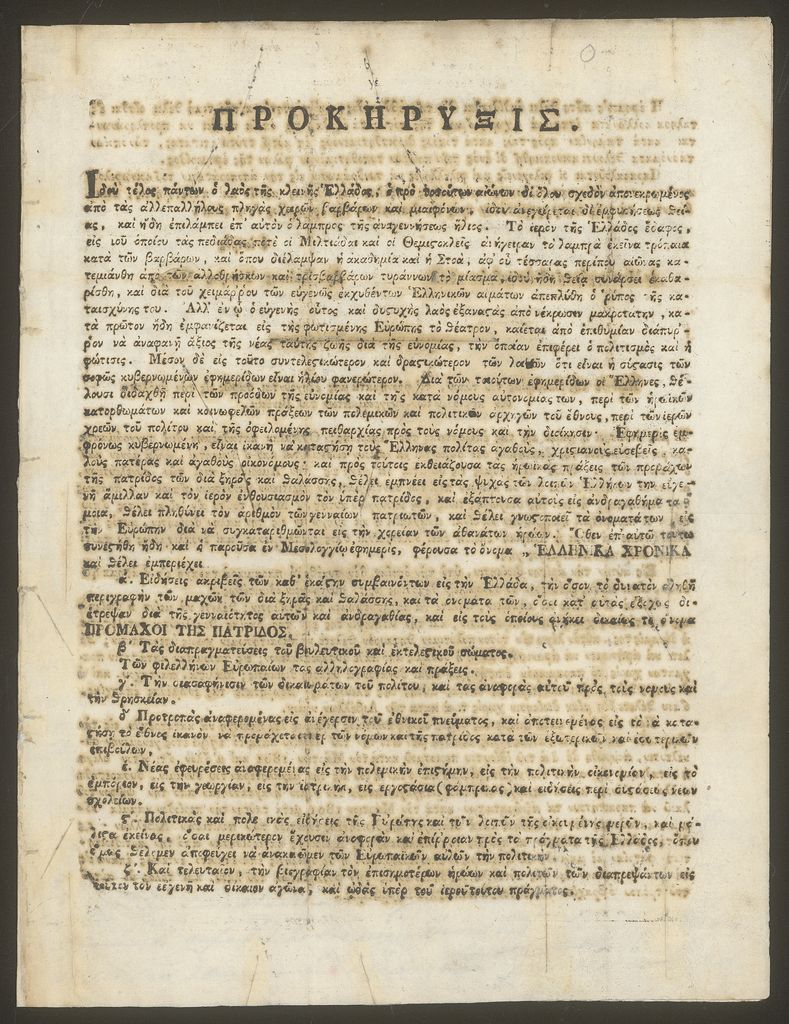 Αγγελία για την έκδοση της εφημερίδας Ἑλληνικὰ Χρονικά. Είναι το πρώτο έντυπο που εκδόθηκε στο Μεσολόγγι και περιέχει, εκτός από την αγγελία, εκτενές απόσπασμα κειμένου του Άγγλου νομικού και φιλοσόφου Jeremy Bentham για την ελευθερία του Τύπου εν είδει διακήρυξης αρχών της εφημερίδας, και μια σύντομη επιστολή με την οποία παρακαλείται ο αποδέκτης να διαδώσει την αγγελία με όσα μέσα διαθέτει, ώστε να συγκεντρωθούν αρκετοί συνδρομητές.