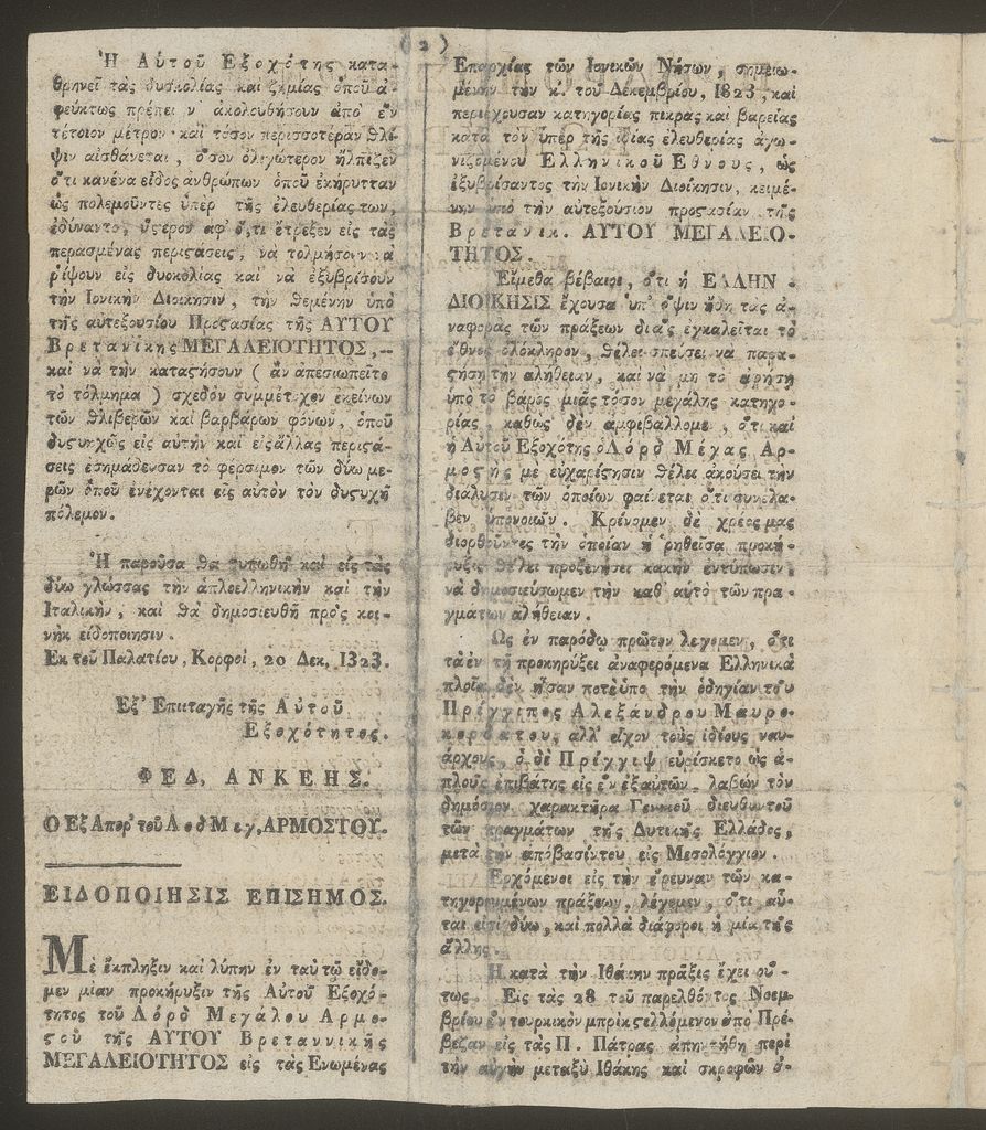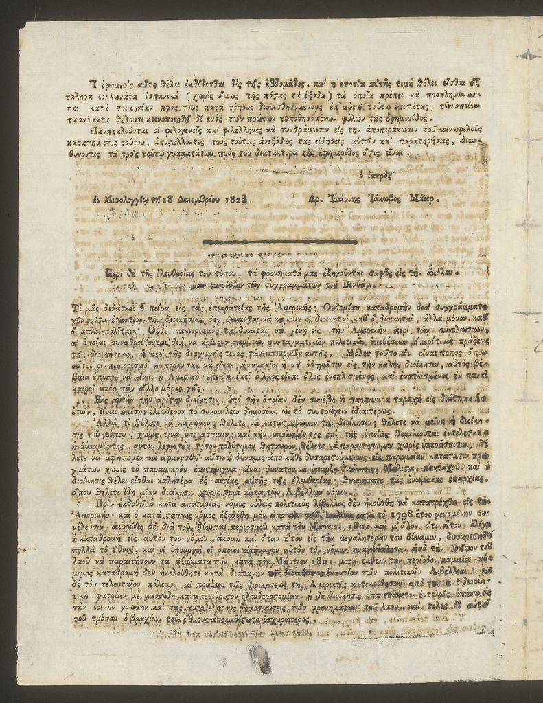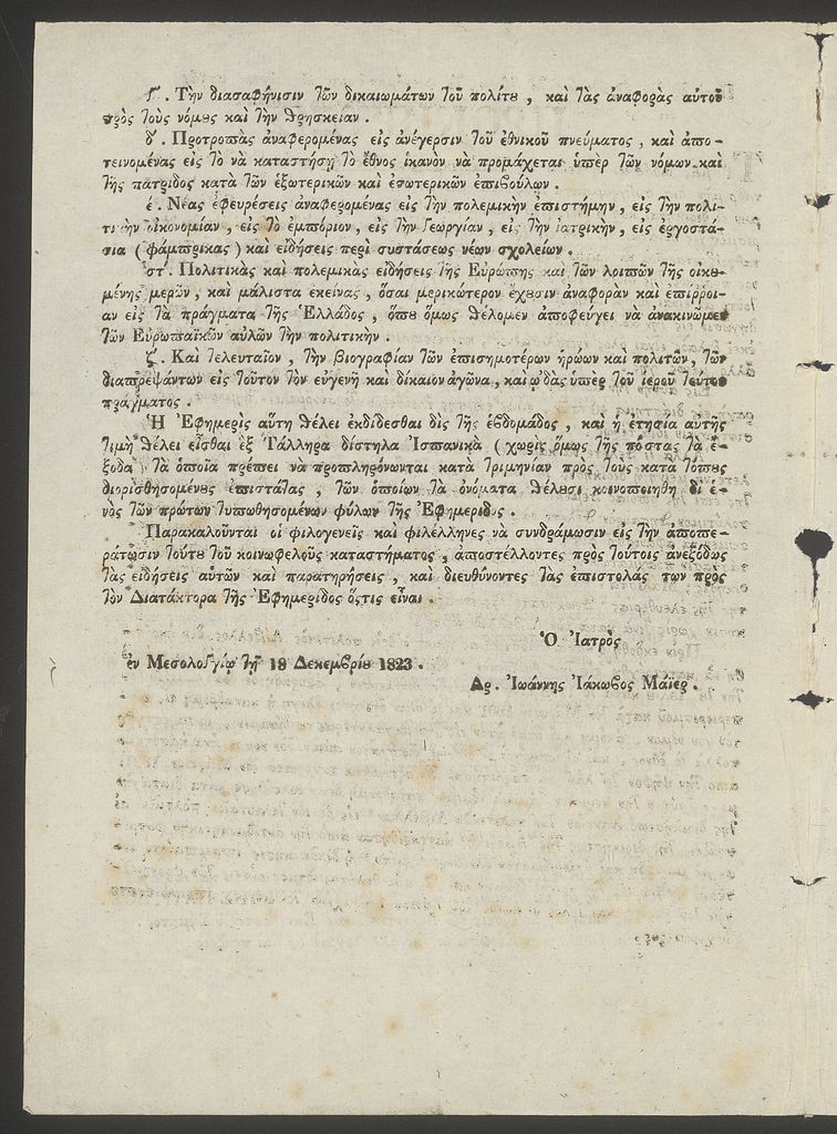 Προκήρυξις – Ἐν Μισολογγίῳ τῇ 18 Δεκεμβρίου 1823 ὁ ἰατρὸς Δρ. Ἰωάννης Ἰάκωβος Μάϊερ.
