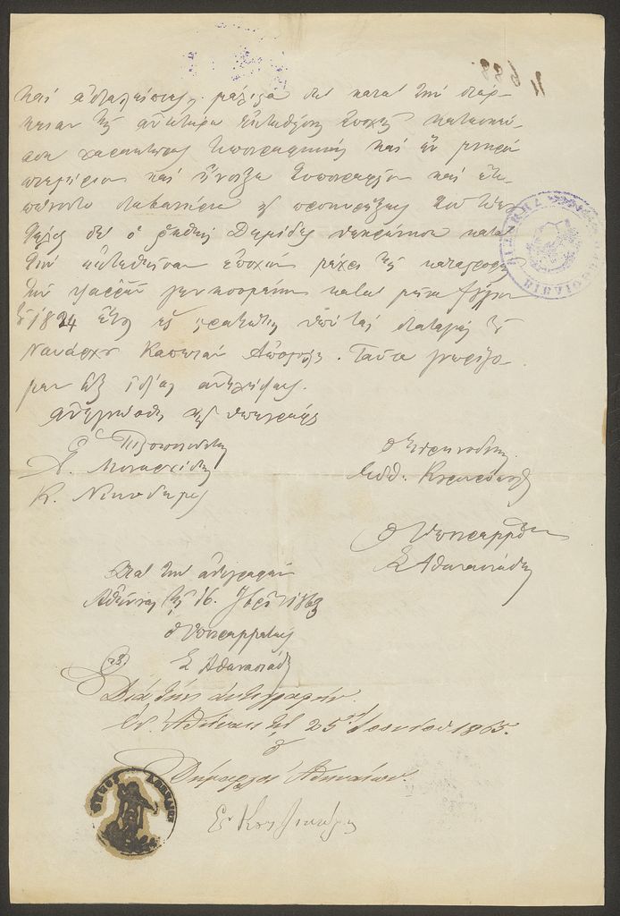 Αντίγραφο ένορκης βεβαίωσης που υπέγραψαν στις 16 Σεπτεμβρίου 1863 οι επιφανείς Ψαριανοί Αναγνώστης Μοναρχίδης και Κωνσταντίνος Νικόδημος για λογαριασμό του μέλους της Φιλικής Εταιρείας και αγωνιστή της Επανάστασης Κωνσταντίνου Δημίδη. Ο Δημίδης είχε μάθει την τέχνη του οπλουργού και του τυπογράφου στο Παρίσι. Από το 1821 ως το 1824 βρέθηκε στα Ψαρά, όπου έστησε ένα αυτοσχέδιο τυπογραφείο και σύμφωνα με μια μαρτυρία ετοιμαζόταν να εκδώσει και εφημερίδα. Στις προσπάθειές του έβαλε τέλος η καταστροφή των Ψαρών τον Ιούλιο του 1824.